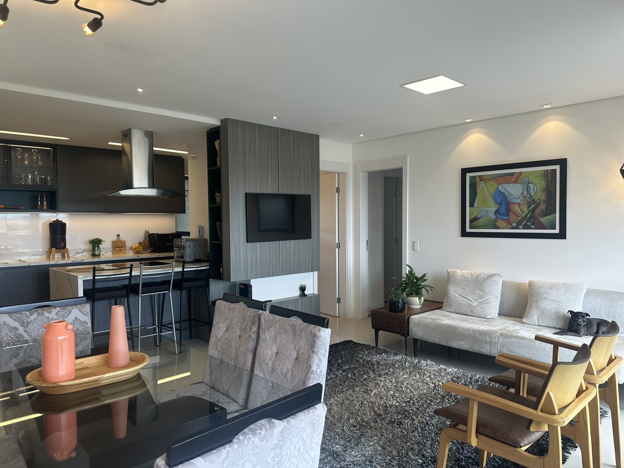 Padrão aberto com cozinha, salas e varanda interligadas e móveis fixos